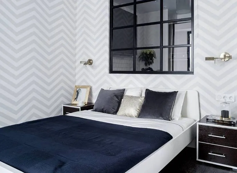 В маленькой спальне используют сочетание белого и синего. Светлый базовый фон с легкими узорами не выглядит стерильным. В компактное помещение идеально впишутся мотивы национальной росписи (дельфтская, гжельская). Орнаменты можно чередовать с однотонными стенами.