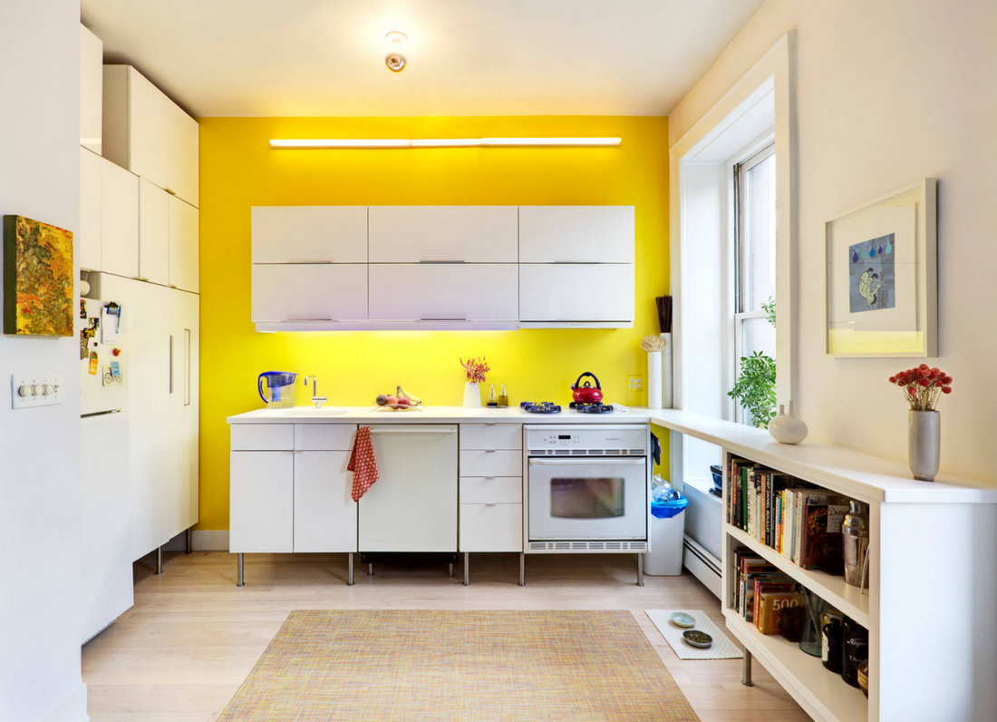 Стены на кухне лучше всего красить в светлые, голубоватые или зеленоватые тона. Они создают ощущение прохлады и расширяют пространство маленькой кухни. Также кухню можно покрасить в яркие насыщенные оттенки. Например, оранжевый и красный будут стимулировать аппетит, а синий и зеленый подойдут тем, кто следит за фигурой.