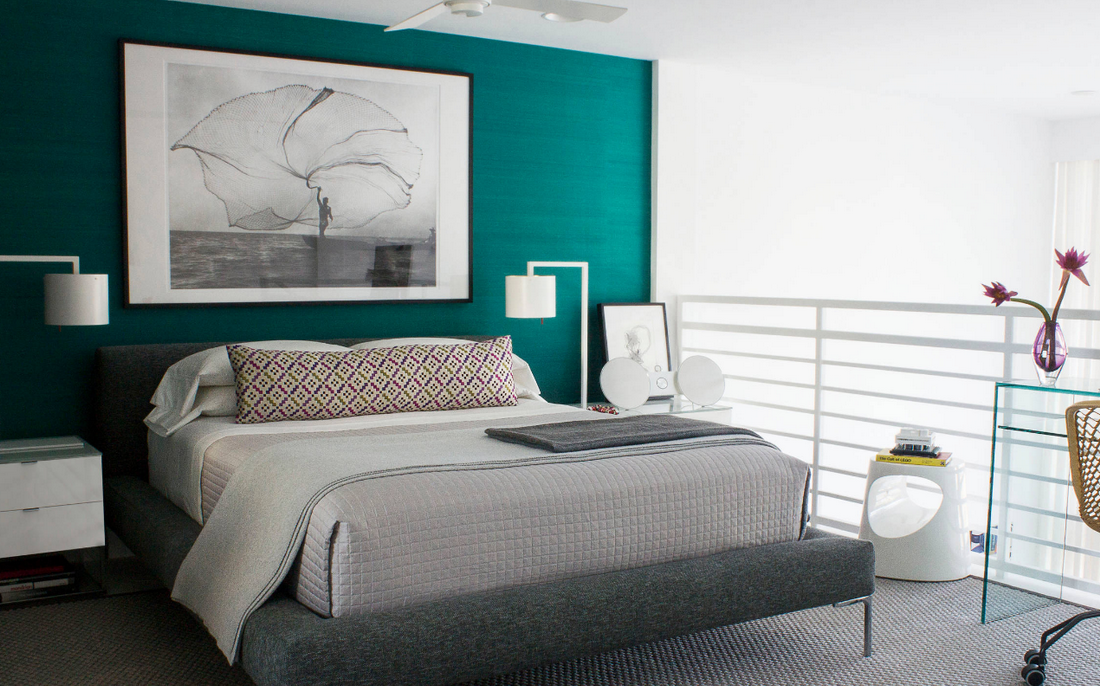 Бирюзовый цвет на стенах в спальне роскошно смотрится с любым светлым дополнением. Насыщенный, сочный оттенок выделяет белые фасады мебели, растительные узоры на обоях и фактурные акценты на поверхностях. Тон можно гармонично сочетать с серыми (серебристыми) и черными деталями.
