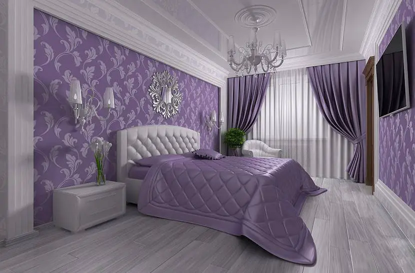 На лавандовых стенах лучше использовать различные рисунки и текстуры. А если акцент делается на меблировке, то хорошо выбирать обивку и предметы с преобладающими фиолетовыми оттенками. Если в комнате высокие потолки, то хорошим вариантом будет расположение там фактурных обоев в лавандовом тоне.