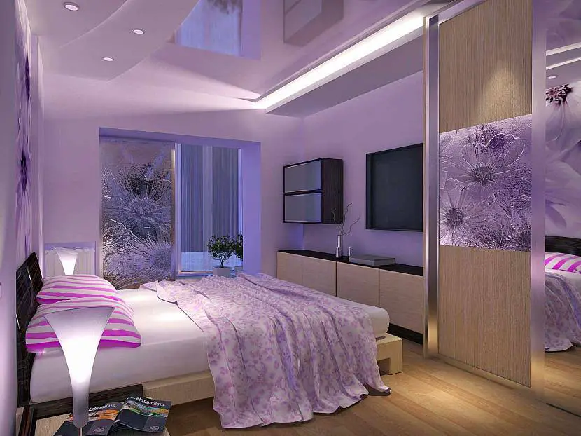 Для супругов подойдут спокойные фиолетовые тона, немного разбавленные золотым. Утром это настроит на позитив и добавит бодрости. Для молодежи лучше использовать насыщенные тона с дополнением темных или шоколадных оттенков. Это подчеркнет творческую натуру хозяина комнаты.