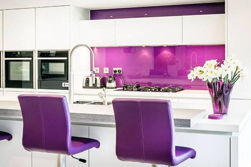 Белая кухня с сиреневым фартуком и фиолетовыми кресламиИсточник mirtesen.ru