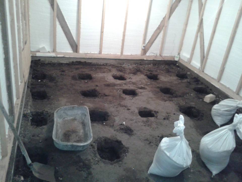 - трамбуем землю, обязательно проверяем плоскость пола по уровню, уклон – 2 см;