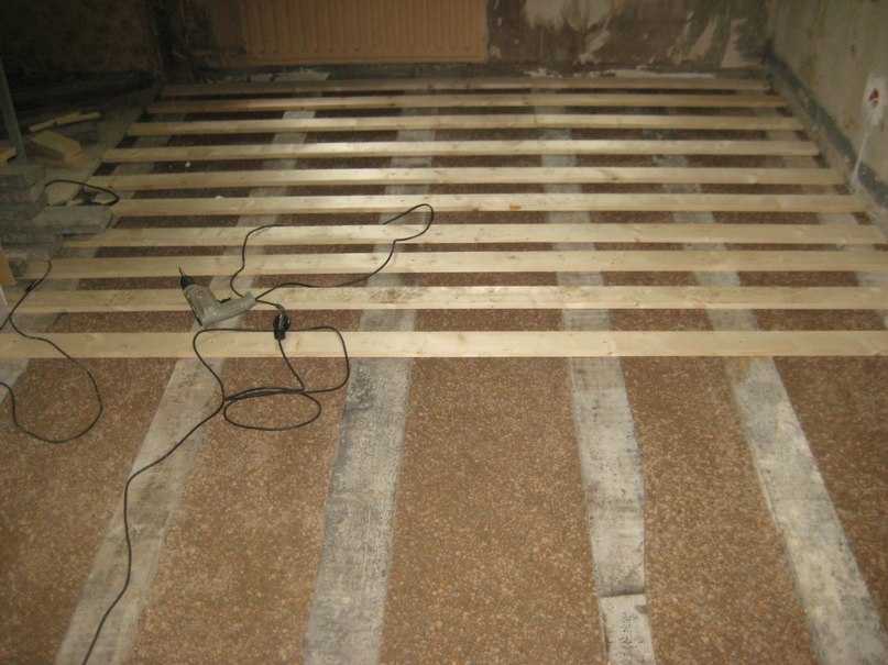 На опору укладываются лаги из бруса, сечение которых должно быть не менее 150*150 мм. Предварительно они пропитываются жидким битумом или водоотталкивающей пропиткой. Между ними прокладывается гидроизоляция и утеплитель. Затем поверх прибиваются доски толщиной не менее 50 мм, обработанные антисептиком. Лаги обязательно монтируются поперек гаража, а доски закрепляются вдоль предполагаемой линии движения машины.