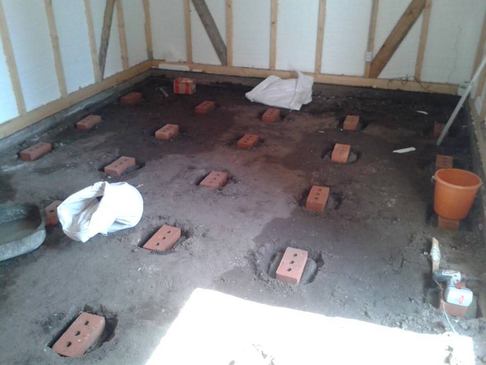 Для его монтажа изначально подготавливается ровная площадка. На нее устанавливаются по уровню столбики или опоры из кирпича. Их количество зависит от размеров гаража и планируемой нагрузки на пол. В качестве варианта основанием для пола может служить фундамент гаража.