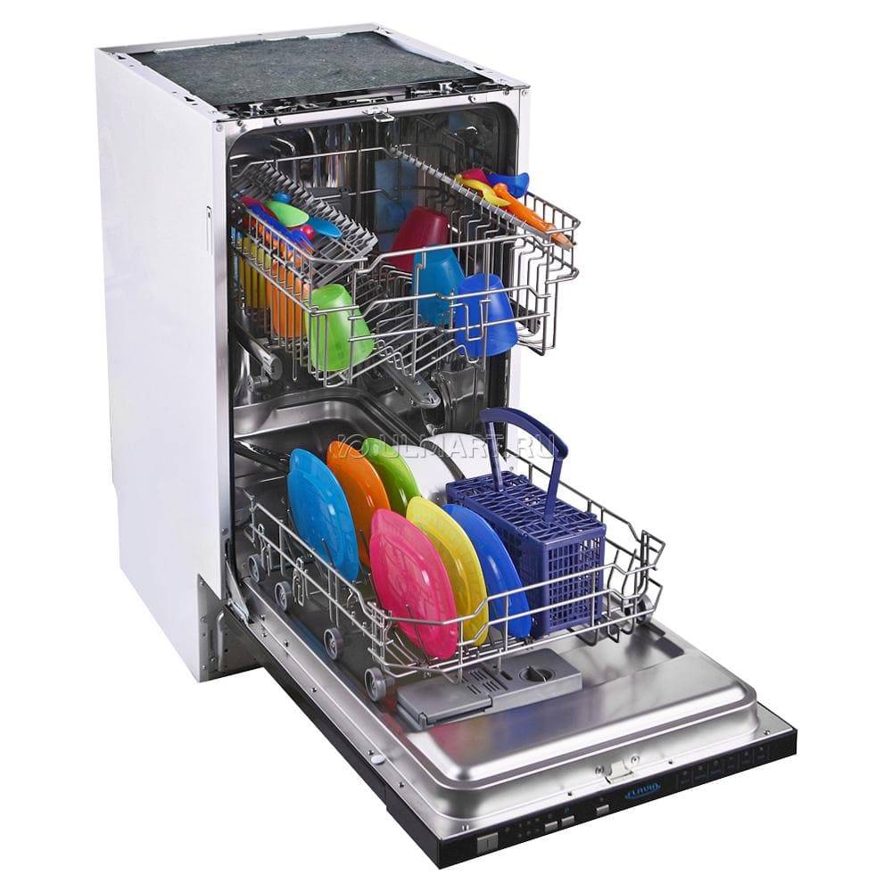 Надежная модель посудомоечной машины с расходом воды в 9 литров и электроэнергии в 0,83 кВт. Имеет три выдвижных корзины и полочку для мелких предметов. Вместительность машины − до 10 комплектов. Машина оснащена функцией «Автостоп», а также возможностями дополнительной сушки, загрузки наполовину и таймером начала цикла. Из недостатков можно отметить маленькое количество вмещаемой крупной посуды и отсутствие светового индикатора на пол. У данной модели машины 4 режима работы, есть функция звукового оповещения и анализатора чистоты воды. Размер машины: 45х81,5х55 см. Стоимость − от 27 000 руб.