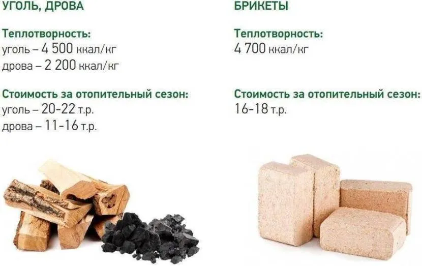 Стоимость угля, дров или прессованных опилок, используемых для отопления, варьируется в зависимости от региона. Поэтому единого решения по выбору того или иного вида топлива нет. Необходимо учитывать текущую цену и проводить анализ сравнительных характеристик.