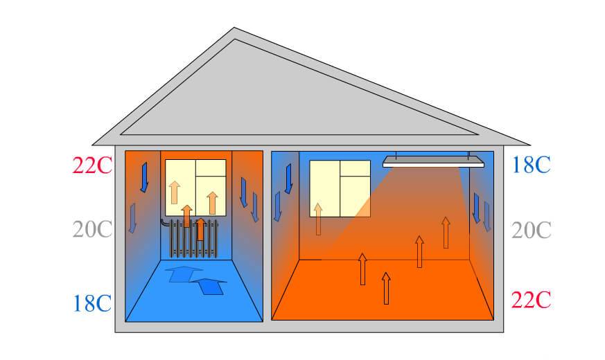 Сравнительный пример распределения теплового потока от инфракрасного и котельного отопления