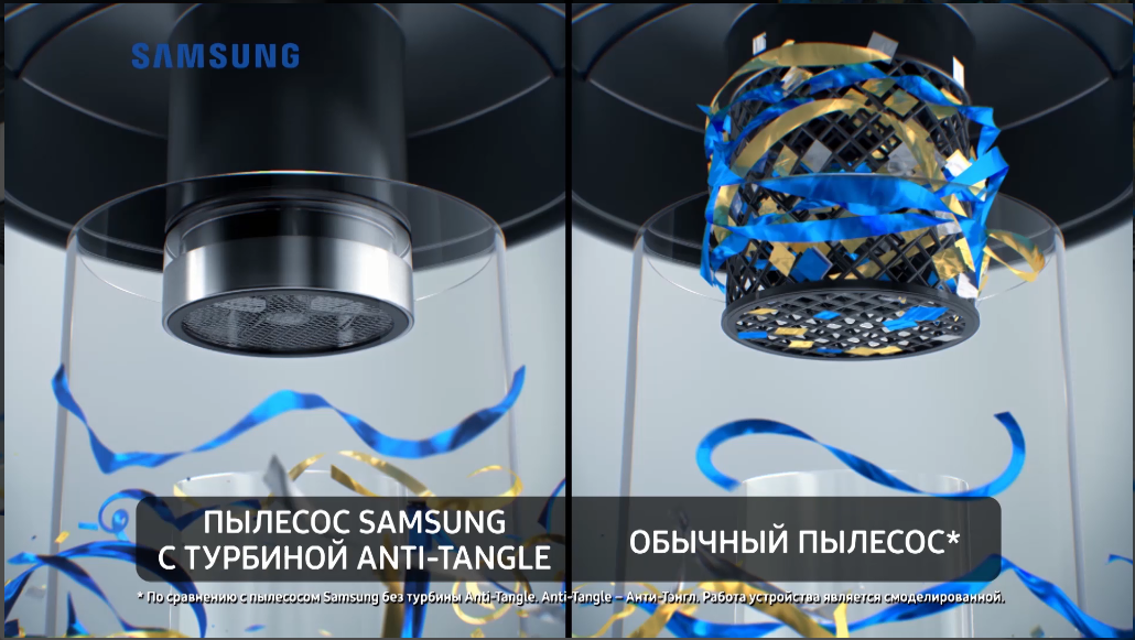 Разработчики из компании Самсунг нашли выход – циклонный фильтр дополнили турбиной Anti-Tangle. Благодаря новой технологии фильтры в приборах не засоряются, соответственно, мощность сохраняется на протяжении всего процесса уборки.