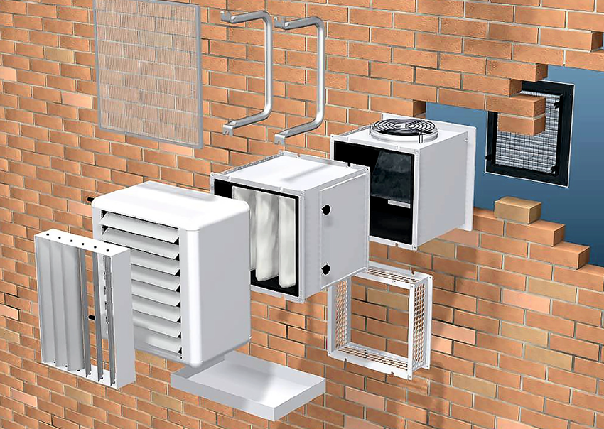 Агрегаты устанавливают в середине канала вентиляции, имеющий круглое или прямоугольное сечение. Воздух, поступающий с улицы, пропускается сквозь систему фильтрации и попадает в калорифер для приточной вентиляции, где происходит его нагрев за счет тепла, который отдает водяная отопительная система, поступающая к теплообменнику через канал воздухонагревателя.