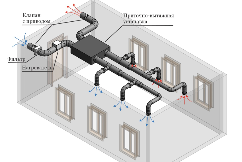 Общая схема устройства выглядит так: приточка и вытяжка проходят через один блок, и тепловыделения от исходящих воздушных потоков частично передаются входящим. За счёт использования теплопритоков снижается нагрузка на остальные системы отопления.