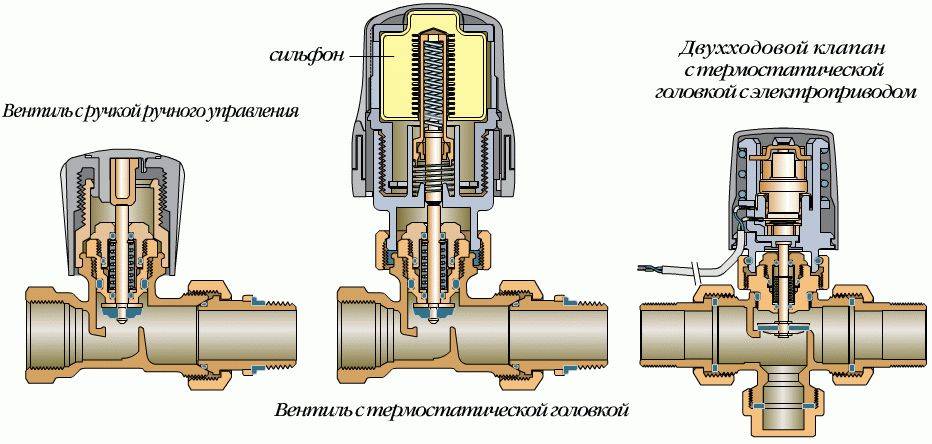 - клапана, который под воздействием команд термоголовки открывает или частично закрывает проход теплоносителю.