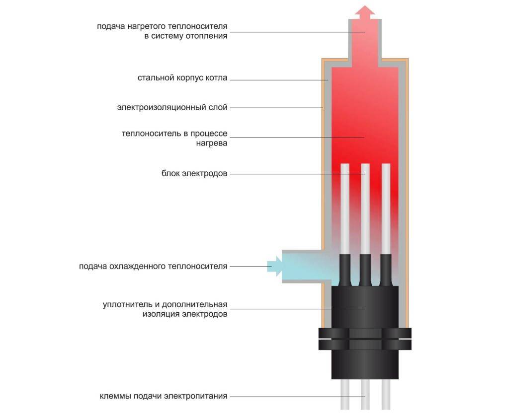 Реакция сопровождается повышением давления в агрегате, что приводит жидкость в движение. Таким образом, циркуляция может проходить без насоса. Электродные нагреватели самые компактные среди всех электрических котлов. Фаза подается на электрод, который находится внутри. Ноль и земля подводятся на корпус. Между корпусом и электродом циркулирует вода, которая в результате нагревается. Такие агрегаты требуют периодичной чистки. Электрод подвержен разрушению, его разъедает сам теплоноситель.