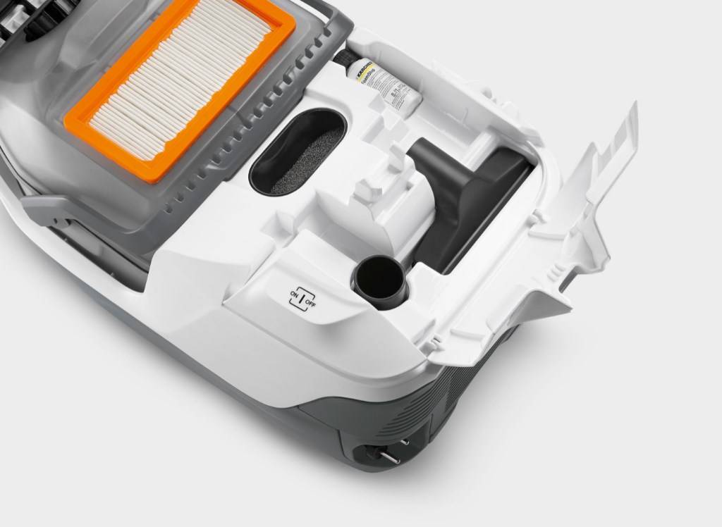 Мощная модель от известного немецкого производителя предназначена для сухой, влажной уборки, сбора воды и освежения воздуха. Пылесос легко проходит по ковру с ворсом и пересекает небольшие препятствия, благодаря колёсам большого диаметра. При сборе жидкости контейнер способен вместить 1,8 л воды.