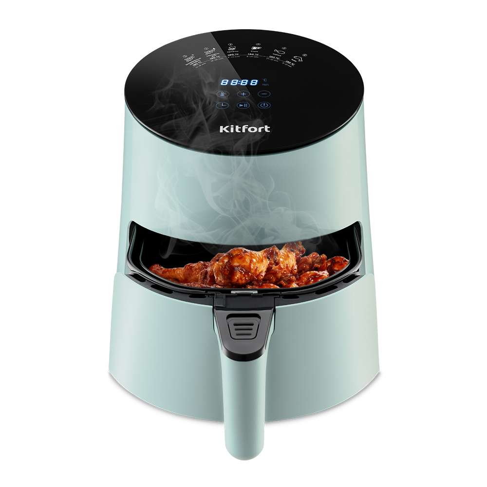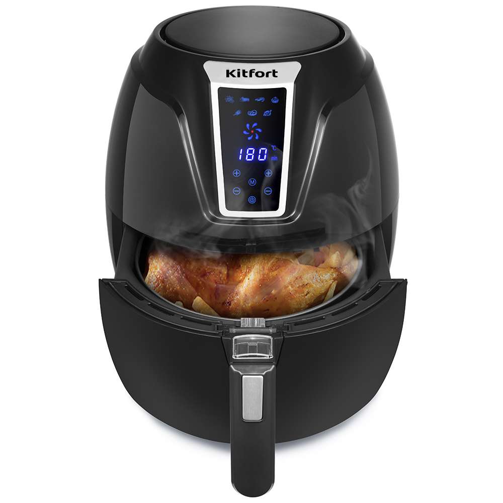 KITFORT KT-2217 подойдет для приготовления продуктов здорового питания, так как при их готовке лишний жир стекает в специально отведенный поддон. Вентилятор обеспечивает равномерное прожаривание продуктов. Прибор имеет электронное управление, его элементы вынесены на верхнюю панель прибора. Там же находится дисплей, на котором отображаются параметры работы. Прибор работает в 6 автоматических режимах при максимальной температуре в 200 градусов, что позволяет выбрать для данного продукта наиболее оптимальный. Блюда получаются сочными, нежными, с хрустящей корочкой. Поддон и съемная корзина объемом 4.5 л имеют антипригарное покрытие.