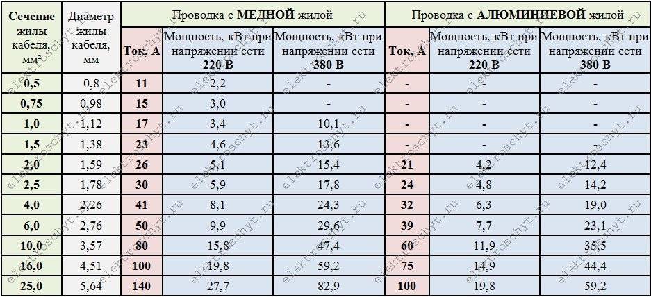 | Сечение токоведущей жилы мм2 | Допустимая токовая нагрузка для медной жилы | Допустимая нагрузка для алюминиевой жилы |