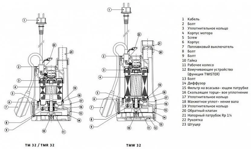 Современные модели оснащены термозащитой, срабатывающей при перегрузке устройства. К осевому валу прикреплена крыльчатка – винтовое устройство, подающее жидкость внутрь корпуса. При включении агрегата крыльчатка начинает вращаться, забирать снаружи воду и проталкивать ее вдоль стенок к выпускному отверстию. На смену первой порции воды приходит следующая – и так до остановки механизма.