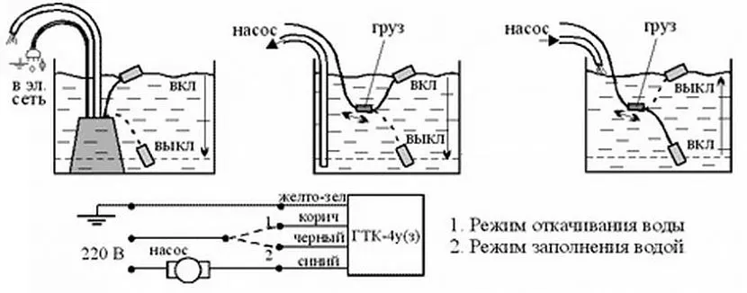 Регулирует периодичность работы поплавковый выключатель. Он следит за уровнем жидкости в резервуаре или естественном водоеме, при его резком снижении выключает аппарат в автоматическом режиме.