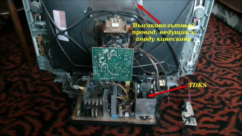 Забыли дать общие указания по ремонту телевизора. Главная плата демонтируется для удобства, оставляете шанс получить удар током даже с выключенного аппарата. Вроде бы еще никто не умирал, ожоги получали. Потребуется разрядить электрод электронно-лучевой трубки. Находится под резиновой прокладкой. Не касаясь руками металлических частей, подденьте отверткой резину, раскачивая из стороны в сторону, извлеките электрод. Разрядите стерженек на корпус. Если видите неподалеку контур заземления, лучше на него. Понятно, для успешной процедуры нужно иметь под рукой евророзетку с правильно подключенными клеммами.