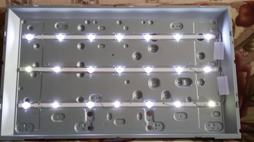 - На некоторых панелях предусмотрено несколько источников света, в таком случае они также должны пройти проверку. Выполнить это можно следующим образом: вытащить матрицу ТВ и подключить в сеть, сразу станет понятно, какая лампа вышла из строя.