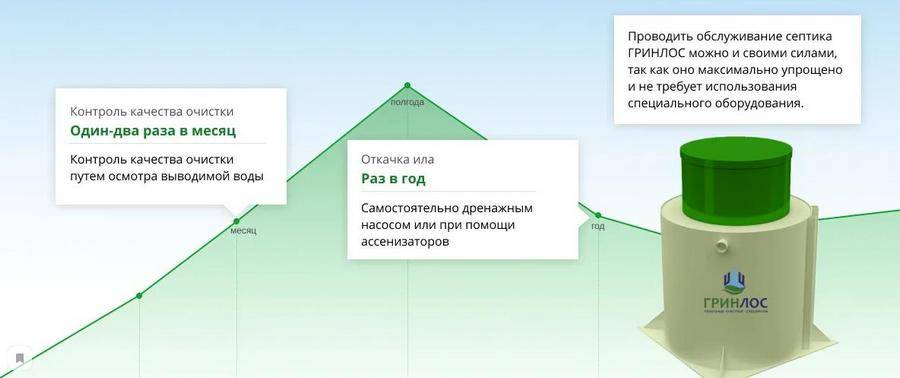 В отличии от продукции других производителей, очистные сооружения ГРИНЛОС нуждаются только в ежегодной чистке. Процедура осуществляется путем откачки отходов из накопительного резервуара в машину-ассенизатор. Операция не сопровождается разливом нечистот или другими нежелательными последствиями. Вероятность проникновения потенциально опасных отходов в грунтовые воды исключается.