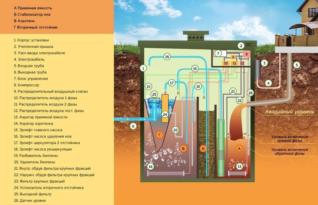 Высокое качество работы септика обеспечивается тем, что в станции применен принцип многоступенчатой обработки. Стоки, попавшие внутрь, обрабатываются с применением следующих методов:
