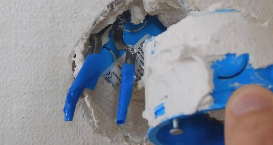 - Вывести жилы внутрь просверленного круга, также сделать отверстие в задней стенке подрозетника и вытянуть через него жилы.