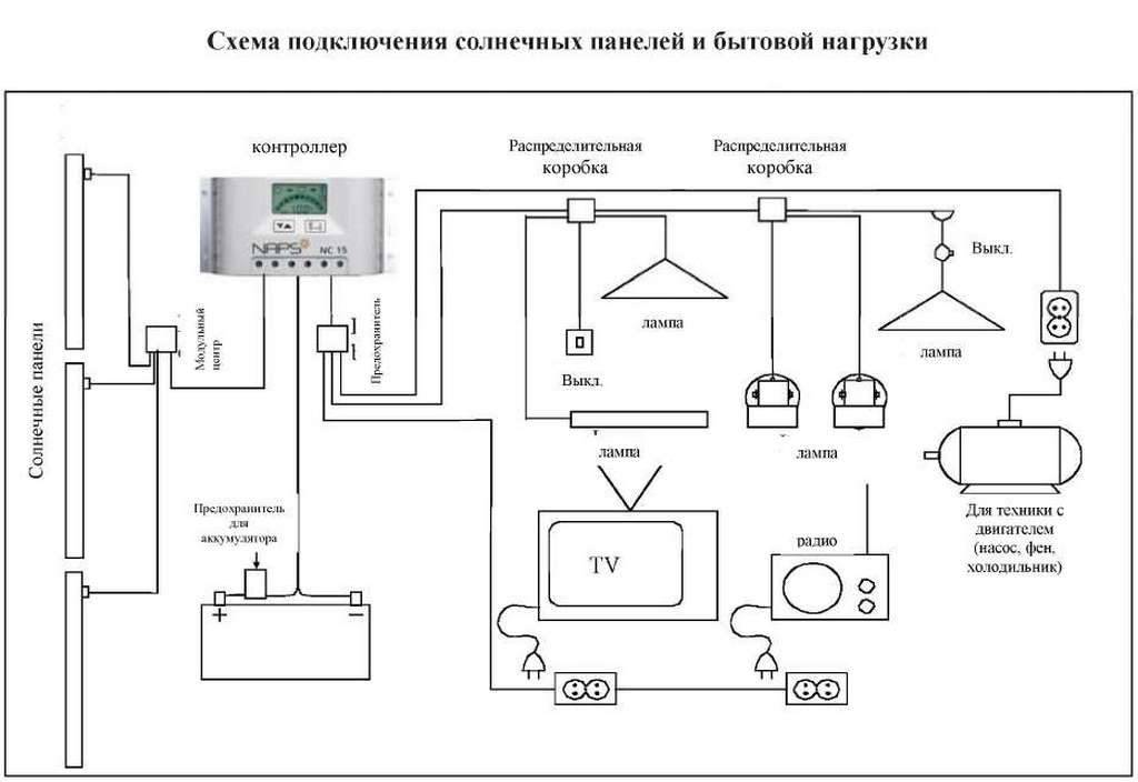 Выбирая такой способ генерации энергии в сеть, будьте готовы к тому, что придется оформлять разрешение в местных энергосетях. Панели подсоединяются к прибору, контролирующему уровень запасенного электричества, называемому контроллером, соединенным с АКБ. Можно считать это предрассудком, поскольку надежность современных солнечных систем достаточно высокая. Видео: Как подключить солнечную батарею к аккумулятору На картинке ниже представлен комплект электростанции, состоящий из таких устройств: Поглощающих естественный свет элементов, которые преобразуют его в электрическую энергию, то есть солнечные батареи. Схема подключения Схема подключения СП.