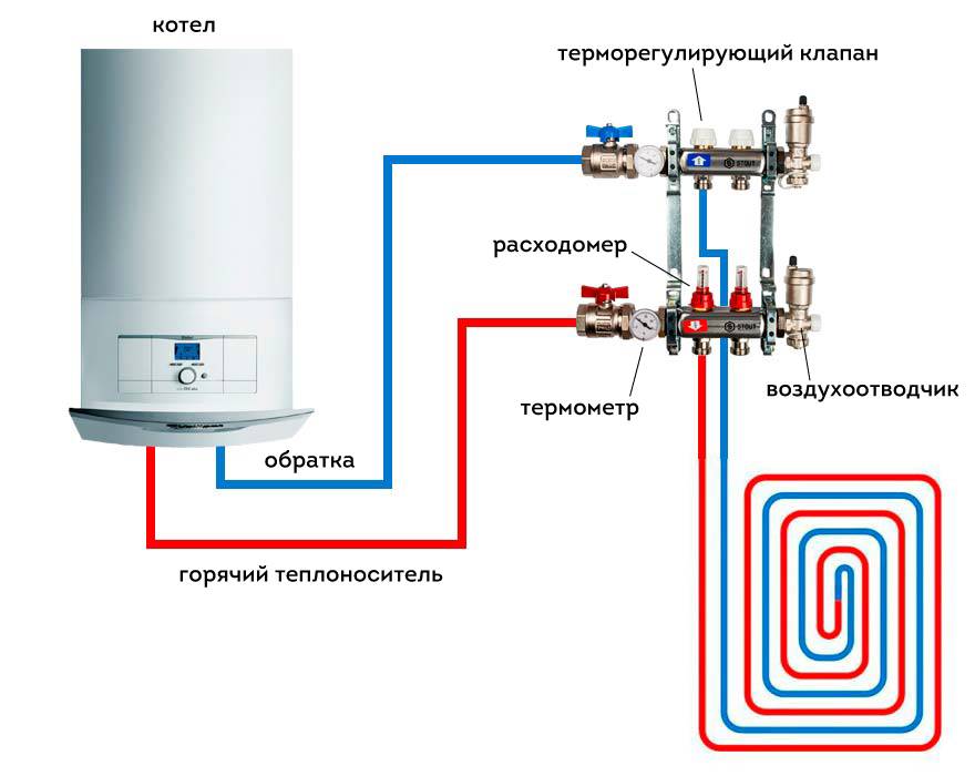Самая простая схема, которая и показана на картинке, представляет собой два контура: основное отопление и пол.