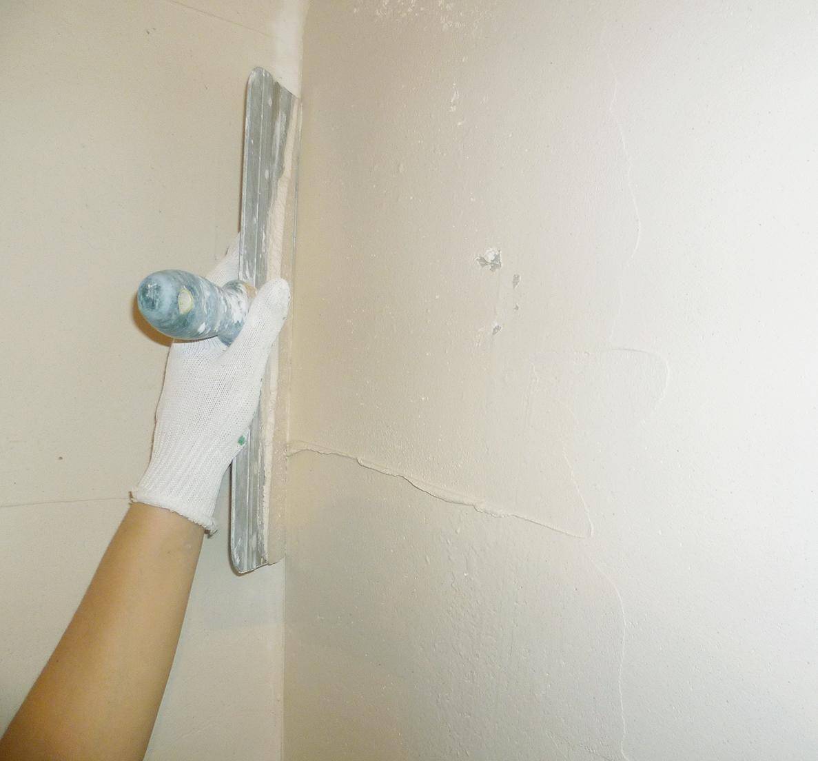 - все излишки смеси удаляют шпателем, держа его перпендикулярно к поверхности стены.