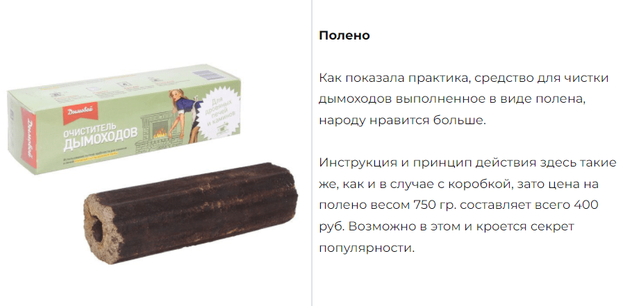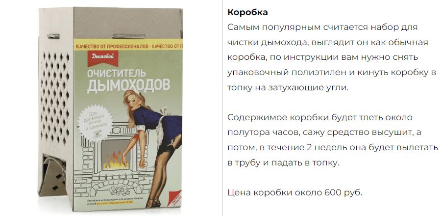 Очистка дымохода с помощью этого средства очень эффективна. Состав доступен на нашем рынке с 1990-х гг.