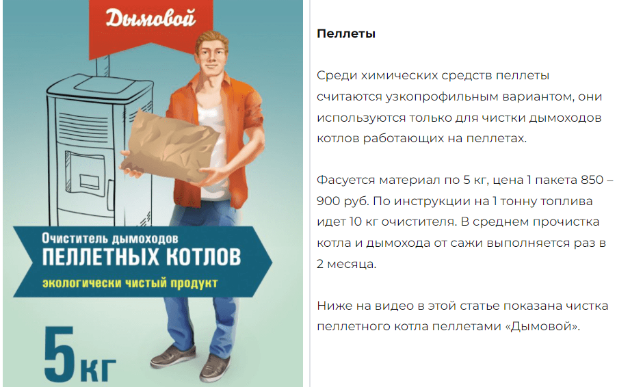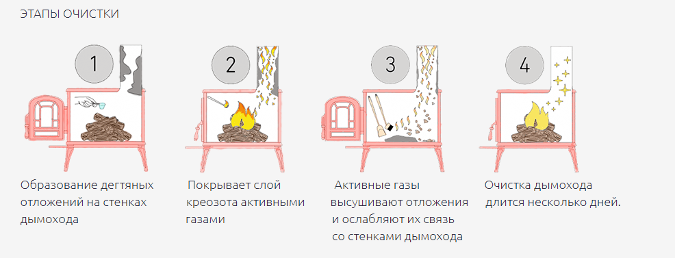 Продукты горения этих веществ либо вызывают отставание сажи от стенок дымохода с последующим ее осыпанием, либо оказывают профилактическое воздействие, делая внутреннюю поверхность трубы менее склонной к обрастанию копотью.