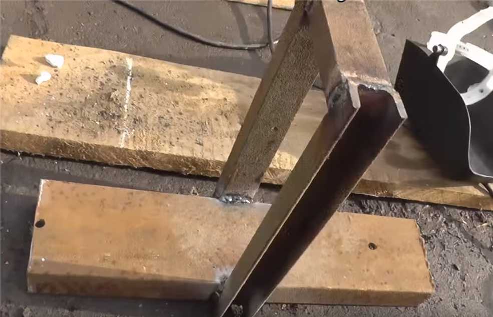 Из швеллера выполняют основу и две платформы. Отступив от одной из сторон около 0,5 м, приваривают вертикальную стойку из того же швеллера. Для этого два отрезка спаривают, чтобы стойка получилась прочной.