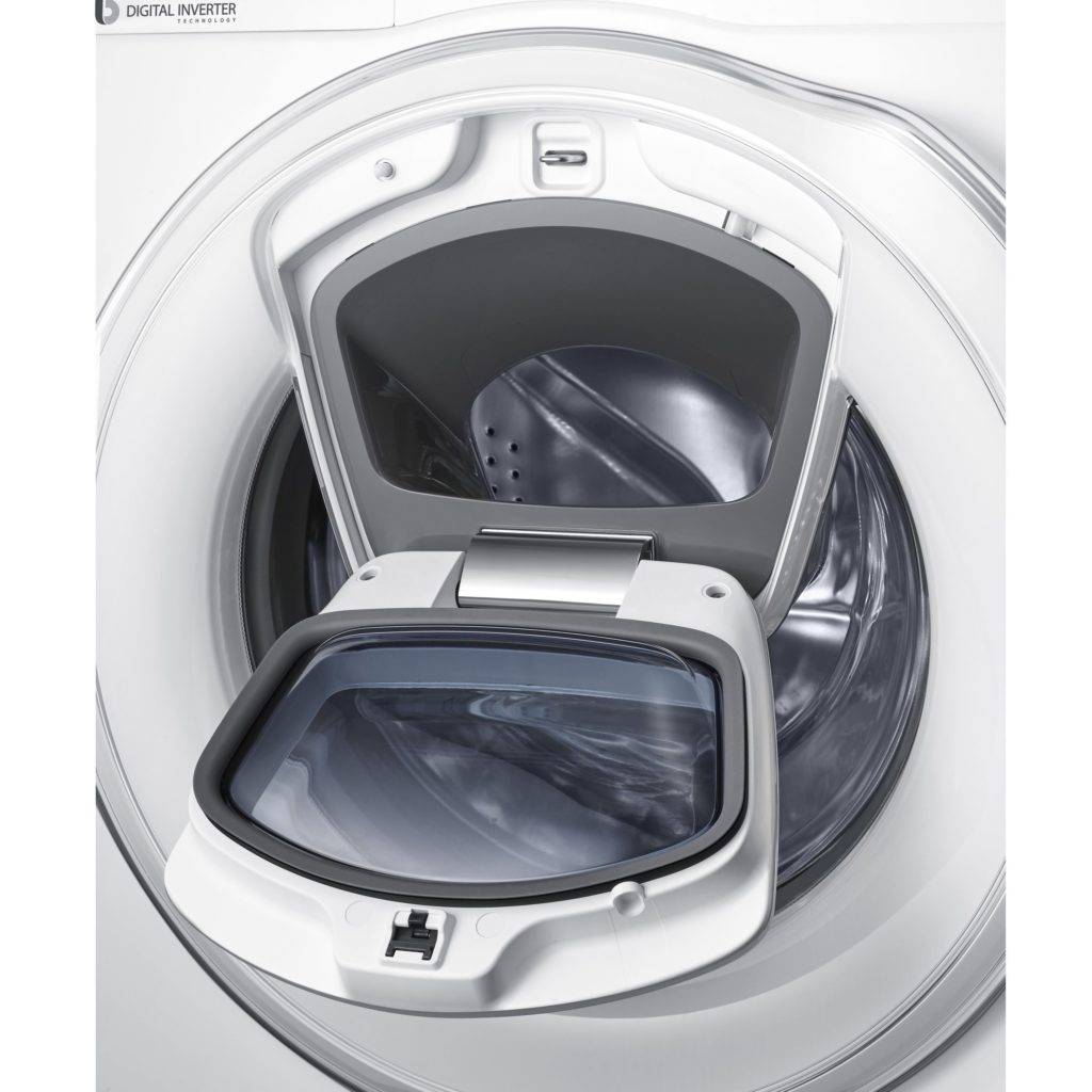 Add Wash: возможность дозагрузки забытого белья в момент стирки. Во многих машинах эта функция была доступна только для имеющих вертикальную загрузку. Но в машинках Самсунг с фронтальной загрузкой эта функция также стала доступной. Для этого вверху передней дверцы располагают небольшой специальный люк, немного выше уровня налитой воды в машине. Дозагрузку можно сделать во время начатого стирального цикла (поставив устройство предварительно на паузу) или для того, чтобы добавить вручную выстиранное белье, для машинного полоскания, отжима или добавления кондиционера, ароматизатора;