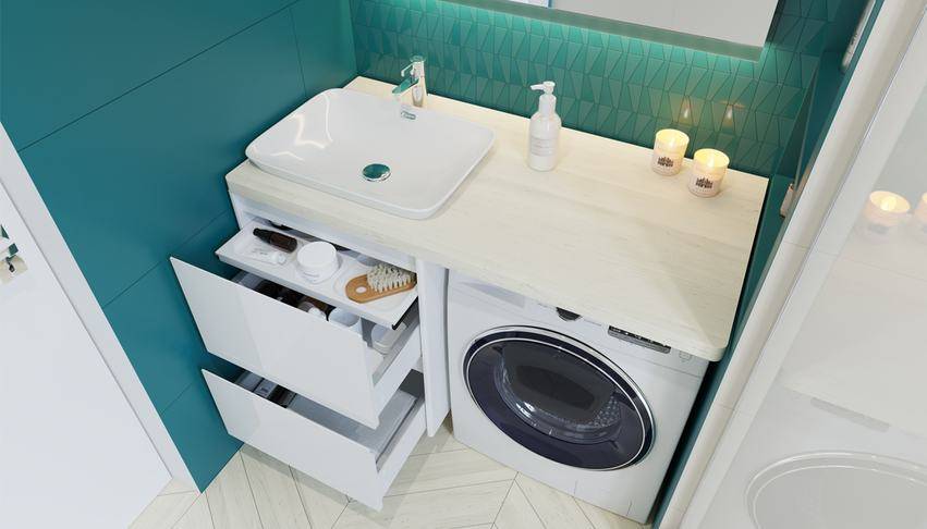 В ванных комнатах с малой площадью под небольшую цельнолитую столешницу очень удобно устанавливать стиральную машину.