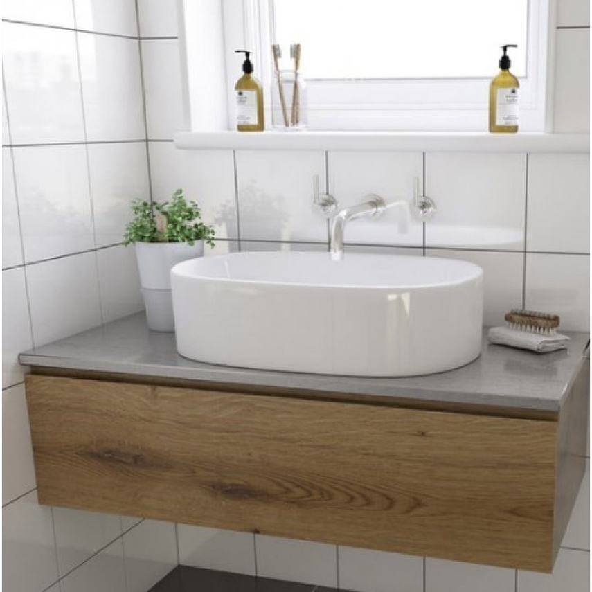 - Овальная неглубокая чаша без отверстия под смеситель. Имеет элегантные очертания, отличается высокой практичностью. Такая раковина идеально подходит для массивной столешницы.