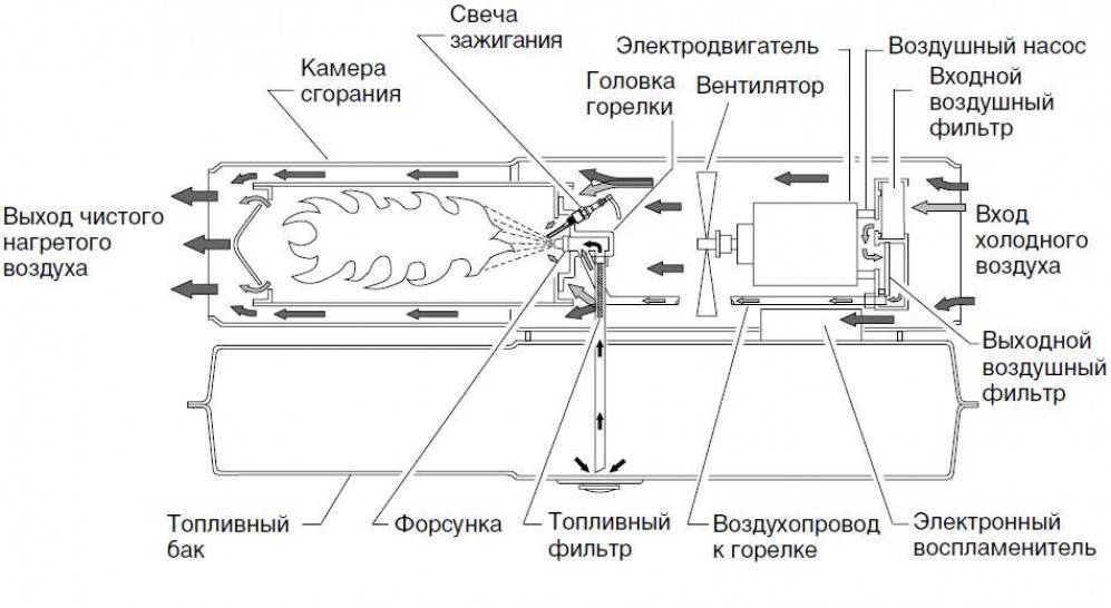 В тепловой пушке, выполненной с прямым нагревом, в нагретом воздухе присутствуют продукты сгорания топлива. Очищения воздушного потока от примесей в конструкции не предусмотрено. Фактически, загрязненный воздух, полученный после нагнетания его вентилятором непосредственно на пламя, распределяется по помещению.