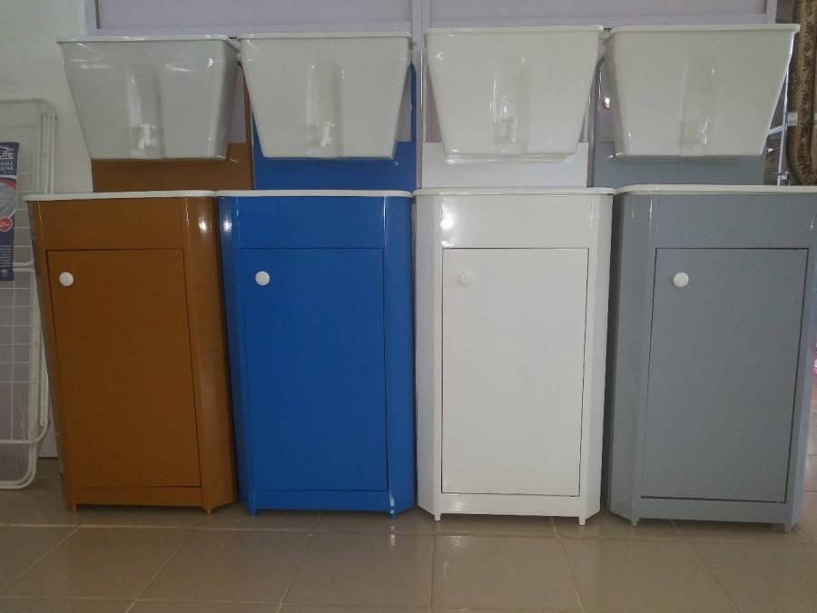 - Тумба. Массивная конструкция с местом под ведро. Предназначена для слива воды. Изготавливается из металла, имеет плотно закрывающуюся дверцу.