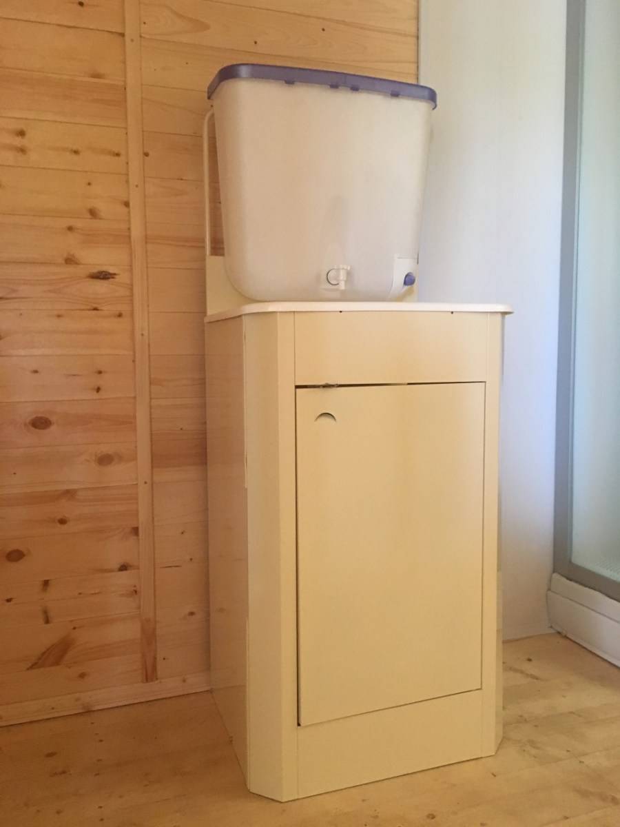 Над раковиной на задней стенке тумбы крепится накопительный бачок для воды. В качестве запорной арматуры используется обычный водоразборный кран или несложный механизм с пробкой, которая пропускает воду при легком нажатии снизу вверх. Материал бачка – пластик (как правило, используются полипропилен или полиэтилен), оцинкованная сталь или нержавейка.