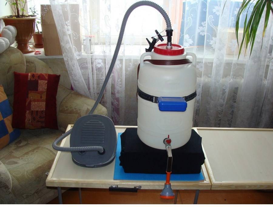 Мойдодыр имеет бак емкостью двадцать литров с подогревом от электричества. Нагреватель запитывается от бытовой электросети.