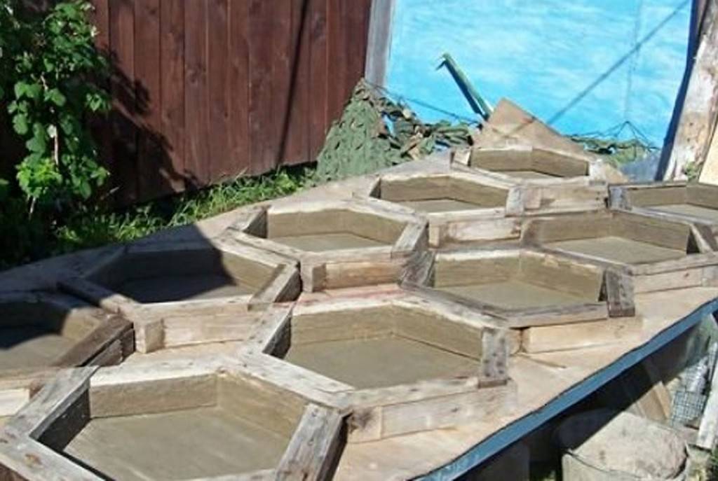 Затем – шаблон. Его делают на бумаге, чертят на земле. Или вовсе не делают – когда нужны асимметричные формы, и хочется потратить на производство минимум времени. Изготовление пластиковых форм для тротуарной плитки заключается следующем: из деревянных элементов собирается каркас, внутренняя часть которого промазывается маслом (чтобы форма легче отставала). В него заливается пластик равномерным, не очень толстым слоем. В теплое время года для высыхания формы достаточно 50-80 минут. Один и тот же каркас можно использовать несколько раз, но если сделать несколько каркасов, процесс изготовления плитки пойдет быстрее.
