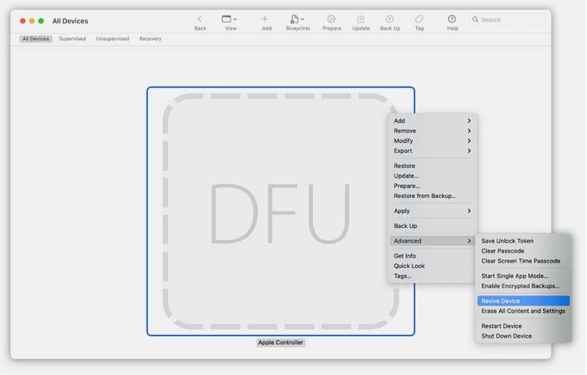 Рабочий Mac с запущенным Apple Configurator 2 распознает подключенный компьютер в DFU-режиме.