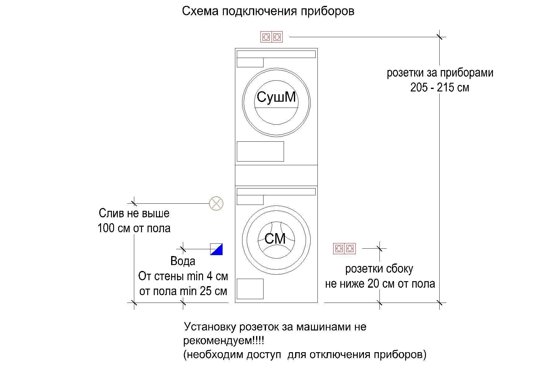 Устанавливая стиральную и сушильную машинку для белья, учтите размещение коммуникаций. Могут потребоваться не только лишь раздельно заземленные розетки, да и доступ к канализации.