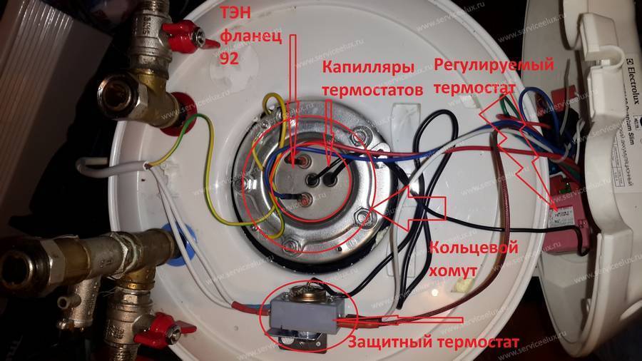 - На одной площадке с ТЭНом установлен блок автоматики – погружной температурный датчик и термостат. Когда температура емкости достигает заданного порога, автоматика обесточивает ТЭН. После охлаждения воды на 3—5 °C термостат снова включает нагрев. Схема электронагревательного бака в разрезе