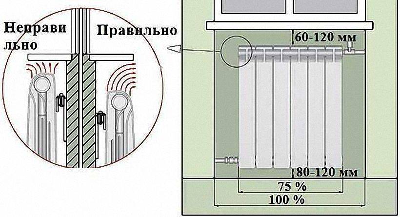 Но для того, чтобы не мешать конвекционным потокам, важно правильно выбрать место для размещения батареи. Прежде всего, сам радиатор должен быть достаточно широким (не менее 3/4 от ширины оконного проема)