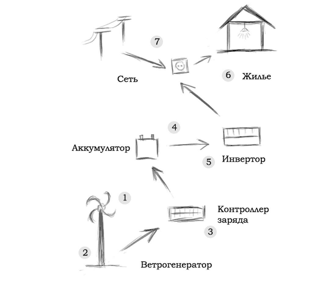 Ток проходя по аккумуляторам одновременно и подзаряжает их и использует АКБ как проводники электричества. Далее ток подаётся на инвертор, где приводиться в наши привычные показатели: переменный однофазный ток 220В, 50 Гц. Если потребление небольшое то сгенерированного электричества хватает для электроприборов и освещения, если тока с ветряка мало и не хватает — то недостаток покрывается за счёт аккумуляторов.
