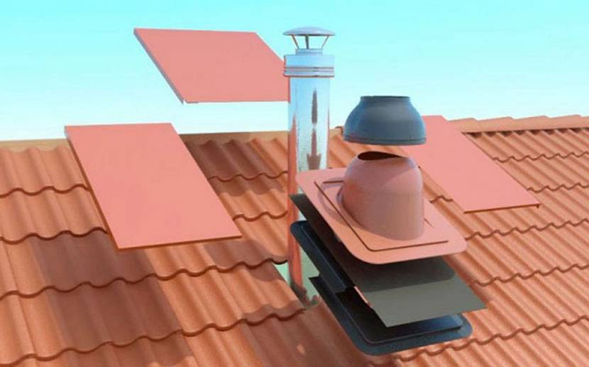 Для их монтажа подготавливается квадратное посадочное место, щели вокруг которого заполняются теплоизолирующим составом. Поверх него выполняется отбортовка, предохраняющая теплоизоляцию от влаги, случайно попавшей в трубное отверстие. Вокруг гильзы монтируются четыре фартучных элемента, со всех сторон охватывающие зоны примыкания трубы к крыше.