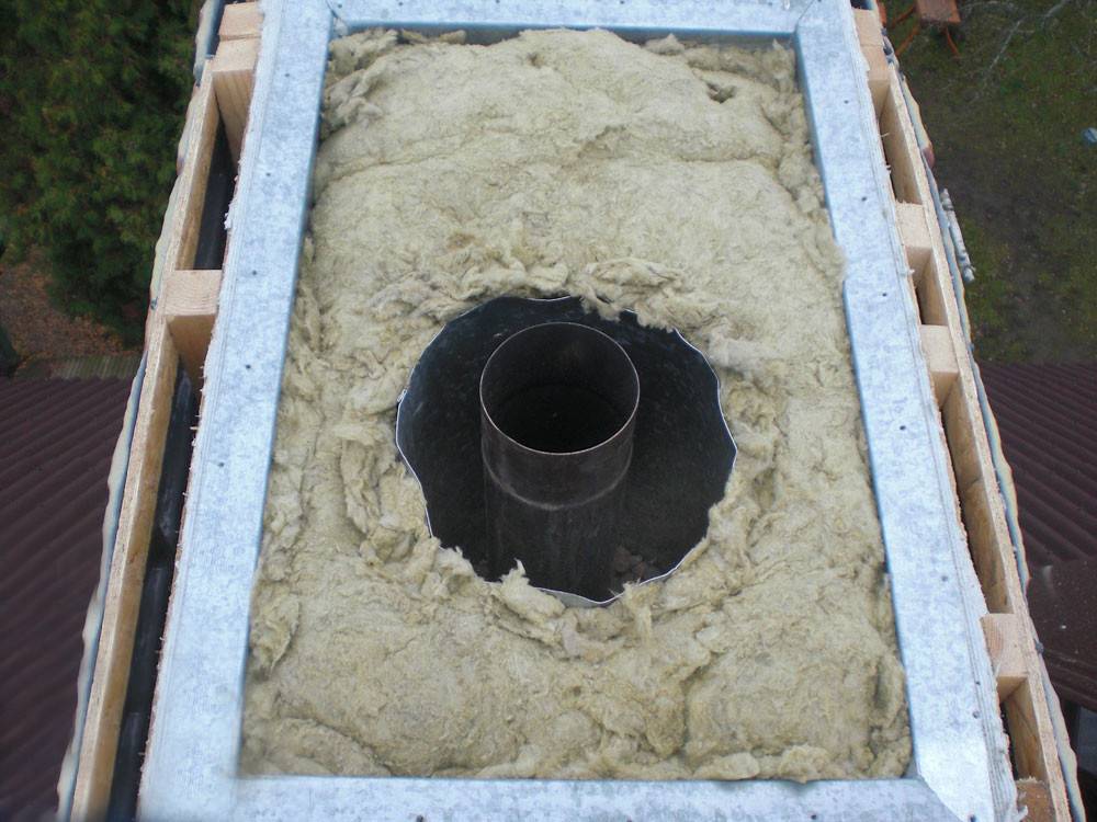 Распространенная конструкция УП для предохранения от нагревания от дымохода выглядит в виде короба вокруг трубы. Короб заполняют негорючими материалами типа стекловаты.