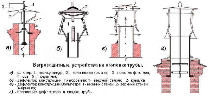 - прикрытие верхней части труб специальными защитными зонтиками или колпаками, которые препятствуют попаданию снега и дождя внутрь системы, а также участвуют в регулировании скорости перемещения воздушных потоков.