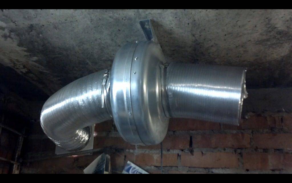 - Зафиксировать вытяжной воздуховод. Нижний конец расположить в 1,5 м от пола – тут все зависит от высоты подвала. Внешняя часть трубопровода выводится наружу на 0,5-1,5 м выше точки крыши.